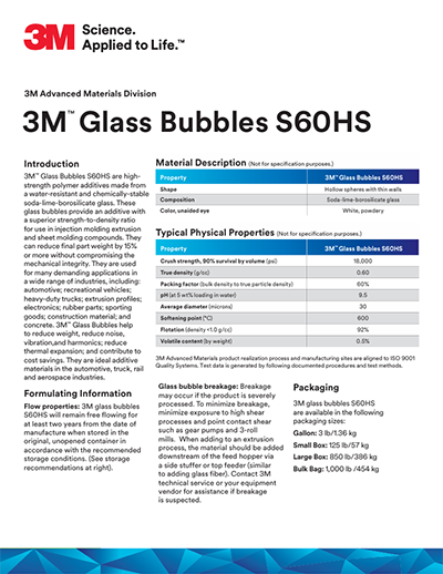 3M™空心玻璃微珠S60HS的典型密度为0.60g/cc,等静压强度为18000psi,这是一款强度-密度比优异的添加剂,可用于注塑挤压成型和片状模塑料。可以在不影响机械完整性的情况下,使最终零部件重量减少15%或以上。