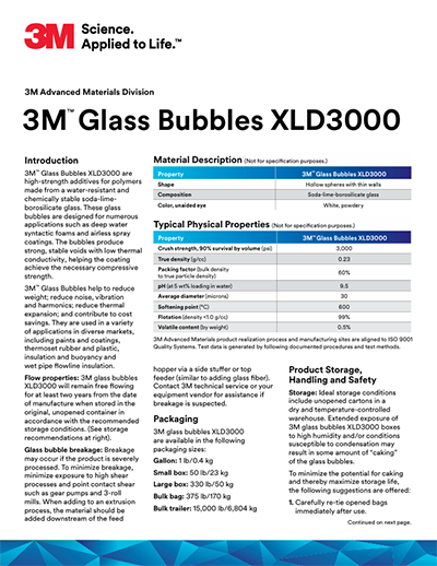 3M™空心玻璃微珠XLD3000的典型密度为0.23g/cc,具有高达3,000psi的等静压强度。这些空心玻璃微珠专为深水合成泡沫和无气式喷涂涂料等应用设计。微珠产生强大、稳定的空隙,导热系数低,有助于涂层获得必要的抗压强度。