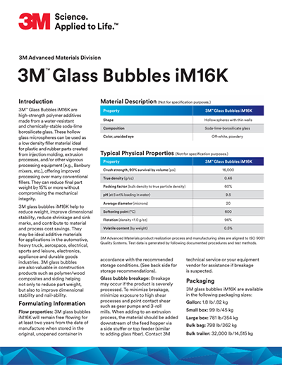 3M™空心玻璃微珠iM16K将改变您对塑料零部件的看法。该产品的密度为0.46g/cc,等静压强度为16000psi,是一款强度-密度比优异的添加剂,可用于注塑挤压成型和片状模塑料。可以在不影响机械完整性的情况下,使最终零部件重量减少15%或以上。